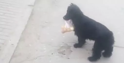 Местный житель увидел собаку, которая помогает нести хозяйке пакет с луком. Женщина вышла из магазина с пакетом продуктов, часть покупок ей помог нести ее пес. Видно как собака преданно оглядывается на хозяйку, всеми силами желая быть ей полезным.