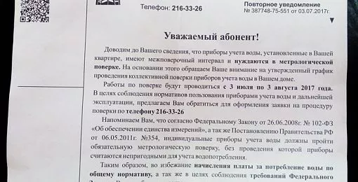 В редакцию «Копейского рабочего» обращаются копейчане с просьбой разобраться в ситуации. В почтовых ящиках жильцов многоквартирных домов то и дело оказываются некие извещения, информирующие горожан о том, что установленные в их квартирах водосчетчики нуждаются в метрологической поверке.