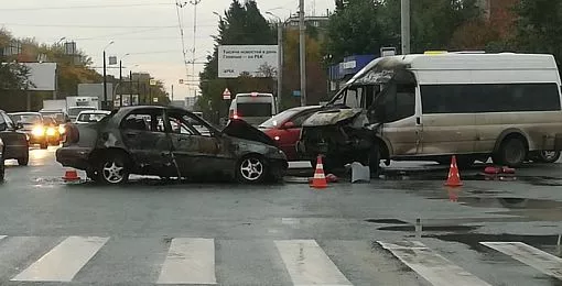 После удара легковушка вспыхнула, огонь перебрался и на маршрутный Ford Transit. Очевидцы пытались потушить пламя своими силами, но до приезда пожарных справиться с огнем не удалось. В результате обе машины сильно выгорели.