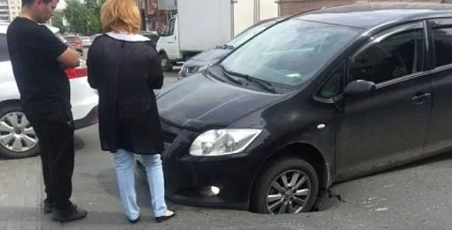 Около 13:50 часов в указанном месте на проезжей части провалилась часть дорожного полотна. Результат – иномарка оказалась «заложницей» дорожной аварии, Toyota попала в образовавшуюся дыру.