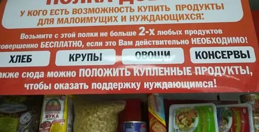 Отметим, что подобные «Полки помощи» регулярно появляются в различных городах России, однако зачастую акция заканчивается тогда, когда продукты начинают брать те, кому это особо не нужно. Поэтому в Златоусте установили правило – тем, кому необходима мука, хлеб, консервы или что-то другое, могут взять только два продукта с полки.