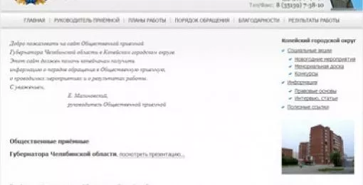 В начале февраля начал работу сайт общественной приемной губернатора в Копейском городском округе. Онлайн-приемная размещается по адресу: http://прием-губернатора-копейск.рф