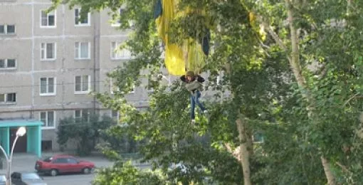 В субботу, 27 июля, в половине седьмого вечера на пульт пожарной части № 210, расположенной в поселке Октябрьский Копейского городского округа, поступил звонок из аэроклуба «РОСТО». Выяснилось, что в селе Калачево во время прыжка одну из парашютисток унесло ветром, и ей необходима помощь. К месту вызова незамедлительно был направлен дежурный караул. Через несколько минут пожарные прибыли к аэроклубу, где взяли координаты предполагаемого места ЧП. Прибыв в лес, огнеборцы увидели такую картину: на березе, метрах в 20-ти над землей, вниз головой висела парашютистка. Прямо посреди леса спасатели установили трехколенную лестницу, но ветки помешали подобраться к девушке достаточно близко, одному из пожарных пришлось еще