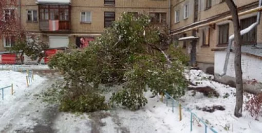 Тут и там на дорогах города можно увидеть многолетние махины, преграждающие автомобилям путь. Дело в том, что снег выпал неожиданно, и деревья еще не успели сбросить листву. Налипание на них мокрого снега привело к тому, что стволы не выдерживают такой тяжести и валятся на землю.