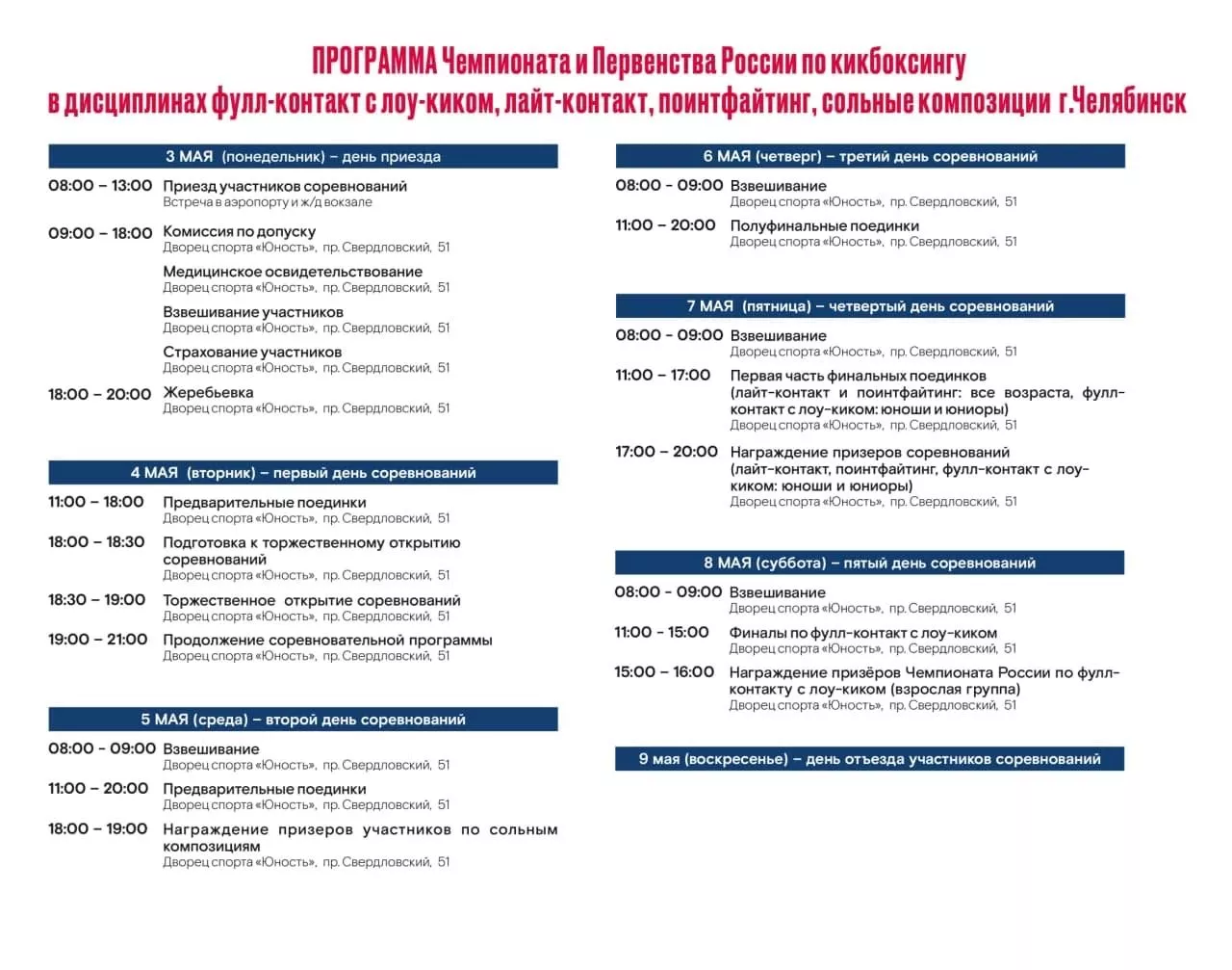 На чемпионате и первенстве России будут разыграны комплекты наград в четырех разделах кикбоксинга: фулл-контакте с лоу-киком, лайт-контакте, поинтфайтинге и сольных композициях (музыкальные формы). Первые сборные команды регионов начнут пребывать уже сегодня, 30 апреля. Готовится к турниру и сборная команда Челябинской области. На правах хозяев соревнований южноуральцы делегируют многочисленный состав – около 200 спортсменов. Все они проводят последние учебно-тренировочные сборы в Челябинске и готовятся показать максимальный результат.