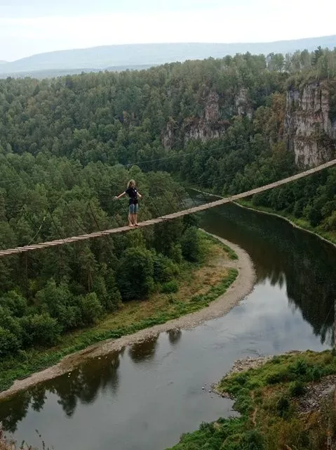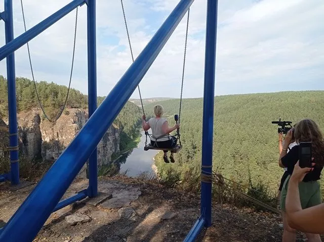 Подъем по отвесной лестнице бывает вознагражден живописнейшим видом со смотровой площадки на реку Ай, которая в этом месте образует изгиб, словно голубая змейка скользит среди скал. А еще наверху можно посетить экстремальные развлечения, поесть и просто отдохнуть в сосновом лесу.